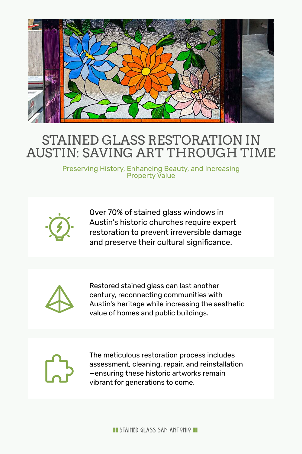 Incorporating custom stained glass into your Austin home can significantly impact both its aesthetic and its market value. According to recent studies, homes in Austin featuring custom stained glass elements see up to a 2% increase in resale value compared to those without. This not only makes stained glass a design statement but also a wise investment.
